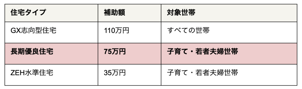 ファミティホームの家は、標準仕様で「長期優良住宅」の認定基準をクリアしているため、子育て世帯・若者夫婦世帯に該当する方であれば全棟75万円の補助金対象になります。