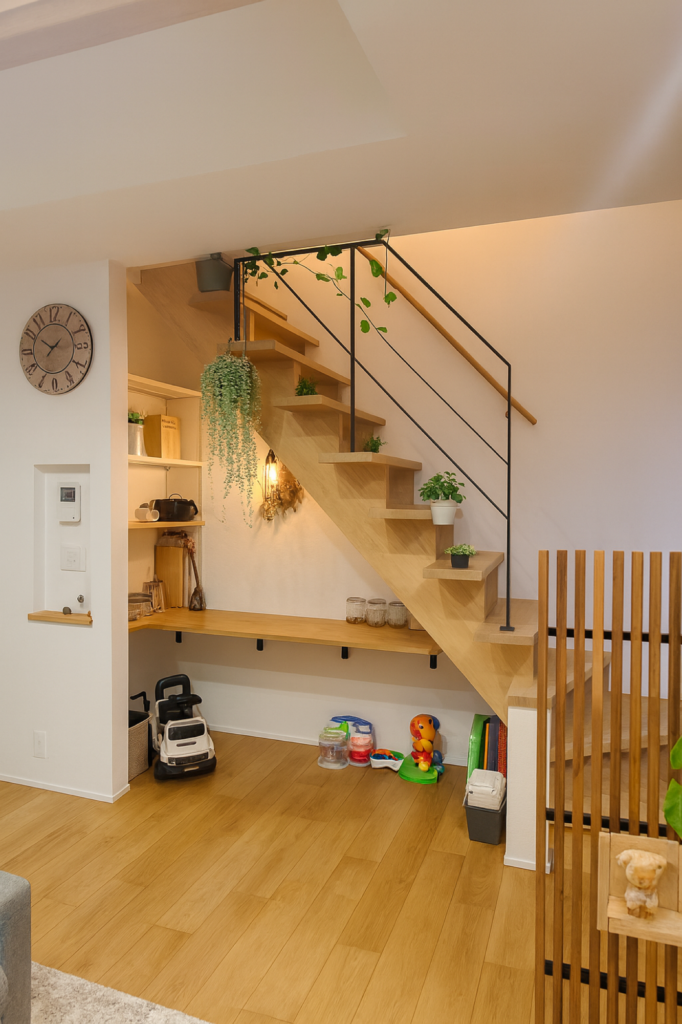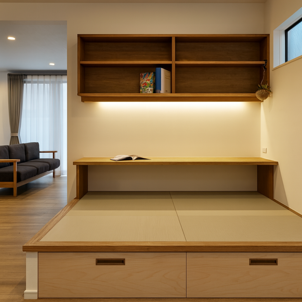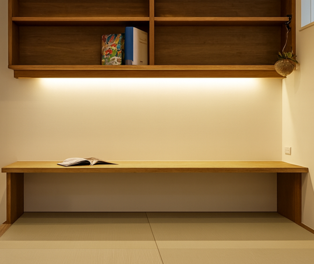 ワークスペースが散らかっていると、LDK全体が雑然とした印象になってしまいます。 デスク周りに専用のシェルフや引き出しを設けるか、リビング収納の隣にデスクを配置しましょう。ランドセルや仕事用カバンを「置く場所」を決めておくだけでも、散らかりにくくなります。小上がりの場合は、畳下収納を活用するのも◎