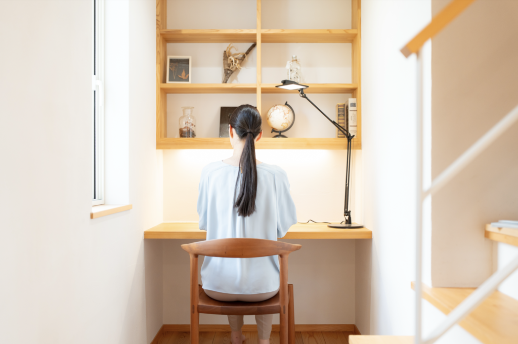 腰壁や間仕切りなどで緩やかに仕切ることで、家族とのつながりを保ちつつ、適度に距離を取ることができ、オンオフの切り替えがしやすくなります。