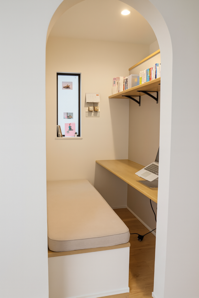 写真の事例は人気のアーチ壁の奥にヌックワークスペースを設置し、お施主さまご夫婦が並んで座れる奥行きを出しました。