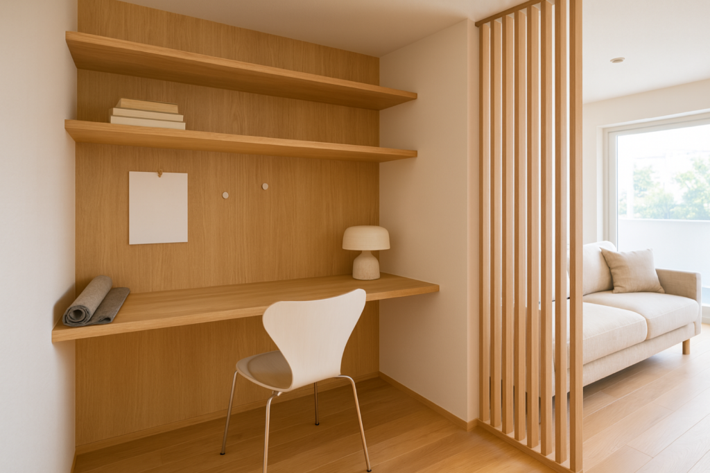 共有空間であるLDKの一角で、作業に集中するためには「適度なこもり感」を演出することが重要。例えば以下のような場所なら、落ち着いて仕事や勉強ができる環境をつくりやすいですよ。