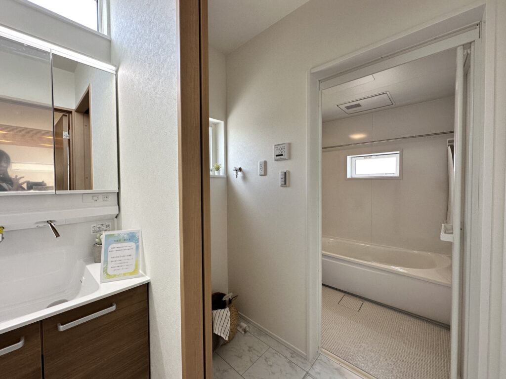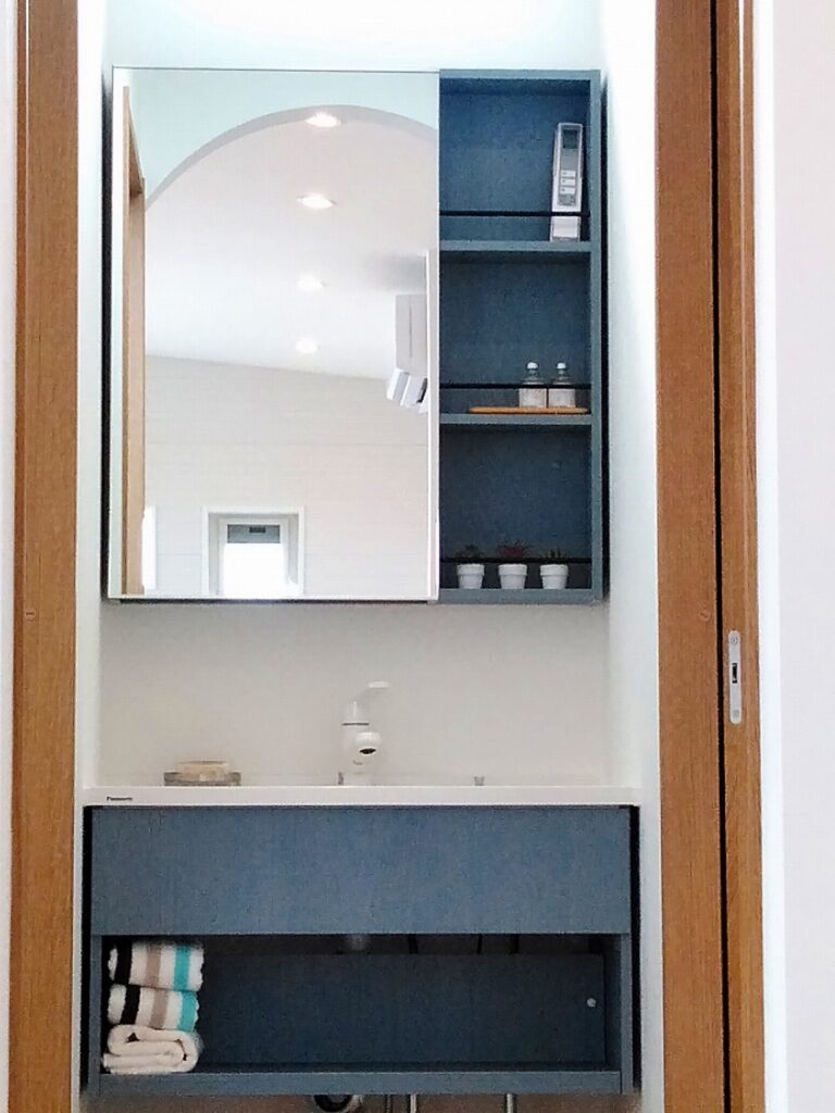 洗面スペースを分散できるので、来客時に脱衣所を見られることがなく、朝の身支度時などの混雑も避けられます。