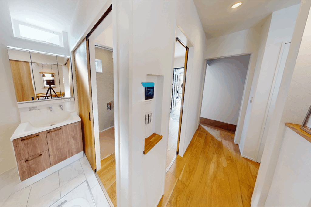 下の写真はシティコート誉田モデルハウスの独立洗面所です。脱衣所と分かれていることに加え、洗面所が2ドアになっているので、動線に行き止まりがありません。さらに混雑を避けられ、使いやすいレイアウトです。