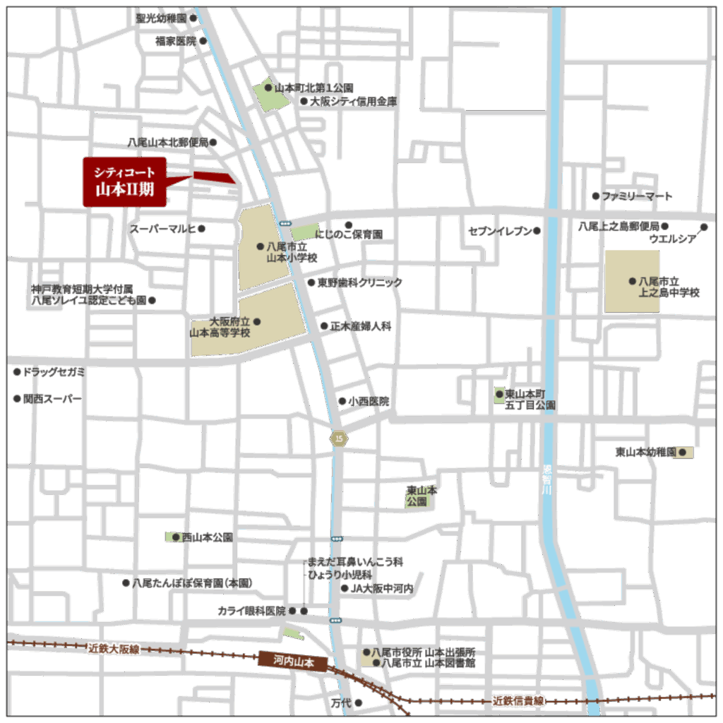 ●近鉄「河内山本」駅から徒歩16分、近鉄「八尾」駅から自転車10分で2駅利用可能。アクセス良好です。