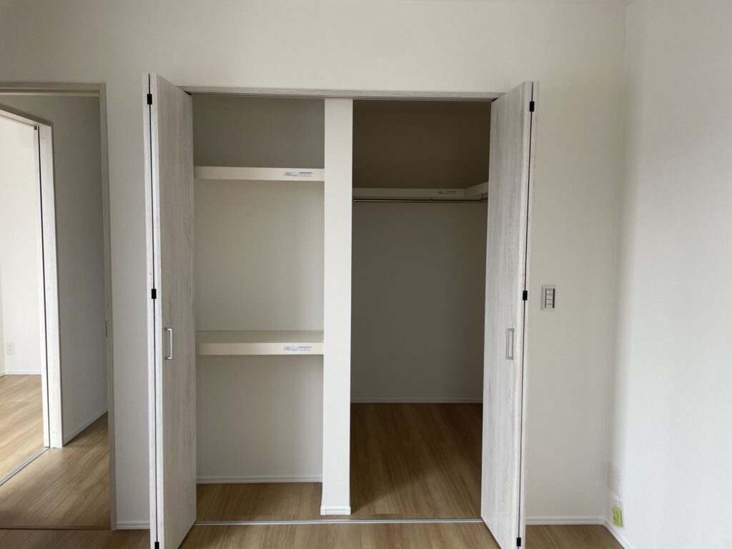 ハンガーパイプと、その上部の枕棚だけを設置するスタイルは、近年、人気のパターンです。シンプルでありながら、デッドスペースになりがちな天井近くまでしっかり活用できるのがポイントです。