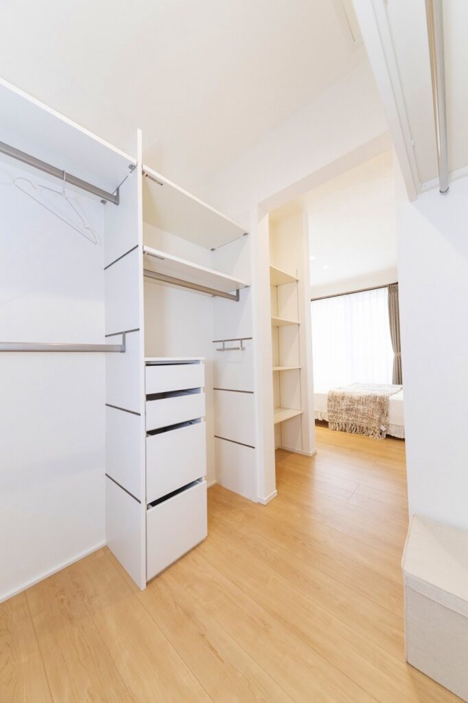下の事例では収納扉とコーディネートしたキャビネットを設置し、畳んで仕舞いたい衣服や、衣料小物も片付けやすいようにしています。