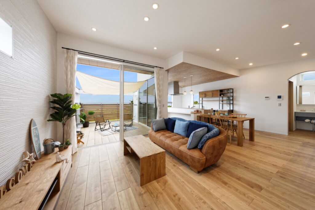室内とバルコニーの段差をなくし、リビングの床と同じ高さでつなげる手法です。内と外の境界を曖昧にすることで、リビングがそのまま外まで広がっているような奥行きを演出できます。