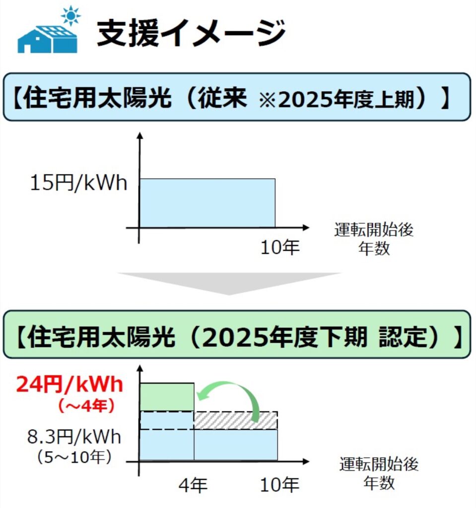 下の表をご覧いただくと分かるように、2025年9月までは10年間一律15円/kWhだった住宅用(10kW未満)太陽光の買取価格が、2025年10月以降は初期4年間が24円/kWh、5年目~10年目が8.3円/kWhに変更されました。