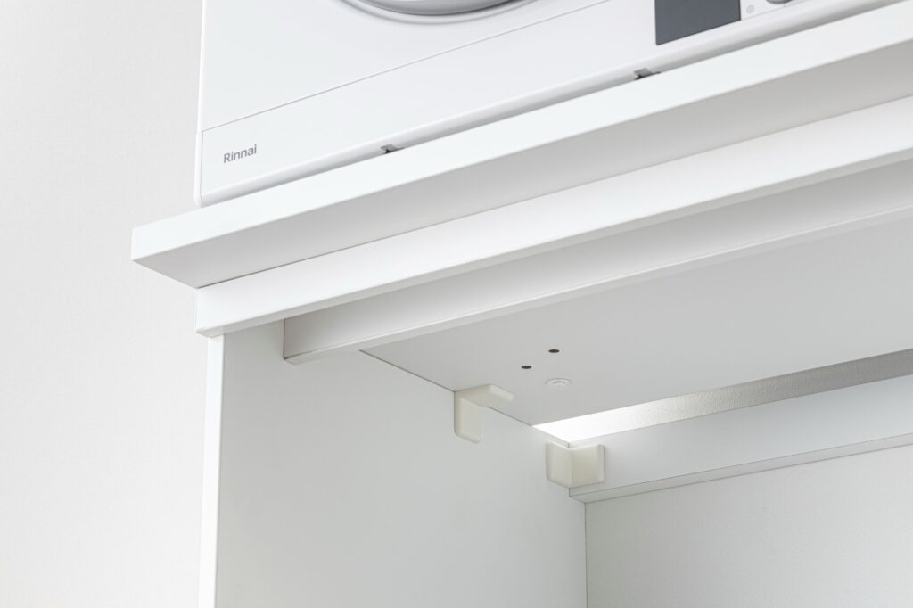 乾太くん専用天板は、後ろに配線や洗濯水栓に配慮した隙間が設けられています。また、どのタイプの乾太くんを設置しても防火上必要な離隔距離を保てるので安心。さらに台の下部は幅木よけ仕様で、壁面に隙間なく使用できるなど細かいところまで配慮されています。高さは3段階で、大型のドラム洗濯機にも対応!