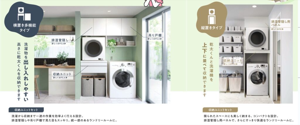 「乾太くん」と洗濯機を並べて設置できる横置き多機能タイプと、「乾太くん」と洗濯機を上下に並べて収納できる縦置きタイプがあります。