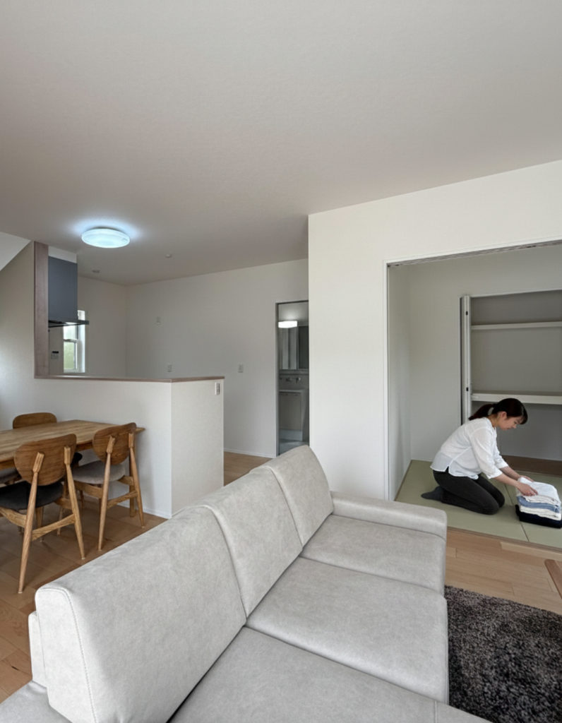 階段横に居室を配置して階段下収納を設ける、小上がりにして畳下収納を設置する、床面の広がりを確保しつつ吊戸棚を設置する…。工夫次第でしっかり収納も確保できます。